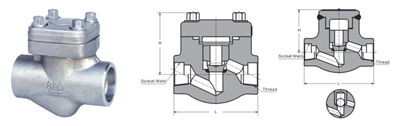 H61H, H61Y type 800 (Lb) socket welding forged steel check valve there are three kinds of body cover connection design. The first is a bonnet bonnet: A valve designed in this design has its body and bonnet bolted to a nut, and a wrap-around gasket (made of flexible graphite 316) is sealed. Customers can also use special metal ring connection. The second design is welded bonnet, according to this design of the valve, the valve body and the valve cap screwed, all-welded seal. Customers have special requirements can also be used when welding penetration. The third is self-tight pressure valve cover, according to the design of this design of the valve, the valve body and the valve cover threaded connection, the pressure from the ring seal.